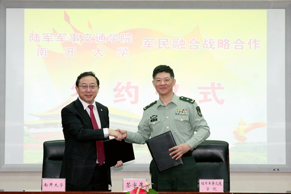 签约仪式上,南开大学校长曹雪涛与陆军军事交通学院院长李明签署《陆军军事交通学院—南开大学军民融合战略合作协议》,南开大学副校长许京军、陆军军事交通学院副院长樊英琪出席仪式。