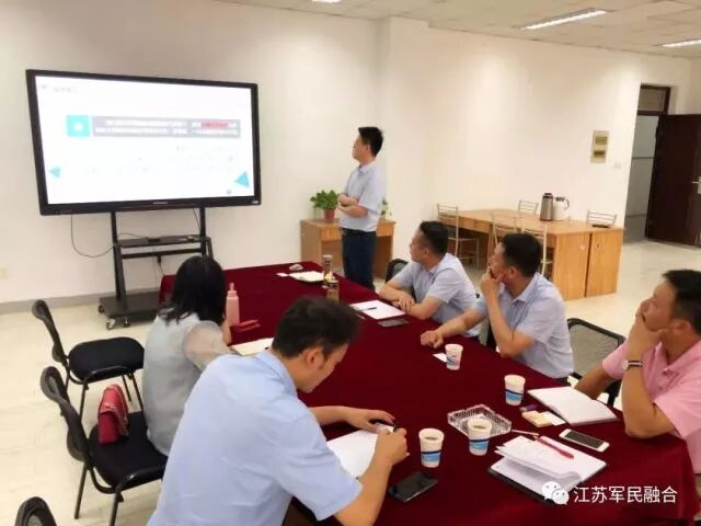 江苏省军民融合公共服务平台负责人周凯向调研组介绍了平台总体架构、特色优势和阶段性运营成效,以及正在建设的线下军民融合创新服务中心的有关情况,平台致力于打造集科研、产业、技术、服务及投融资五位一体的一站式服务机构,构建平台化、特色化、专业化的军民融合发展创新服务体系,现已成为全省具有影响力的军民融合创新服务品牌。